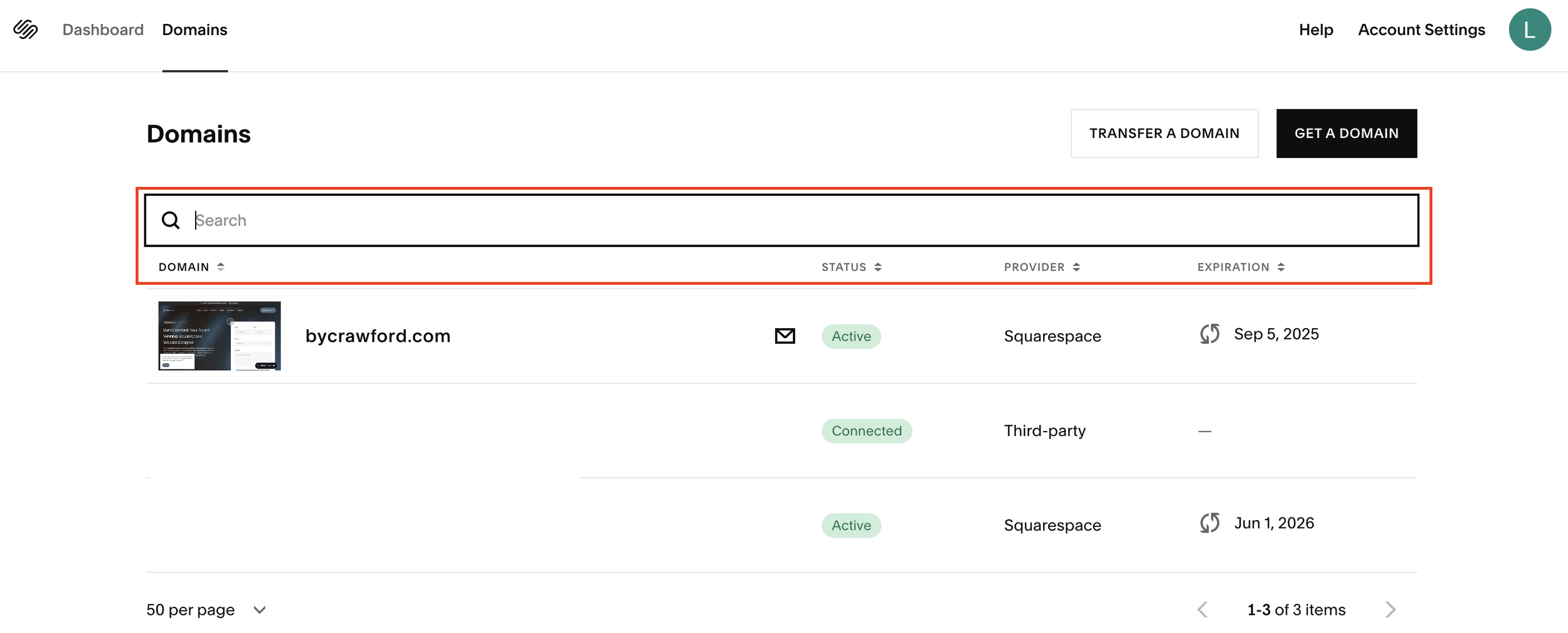 Use the search feature to quickly locate your domain if you manage multiple ones. Just type in part of the domain name (e.g. “Crawford”) to find it faster.
